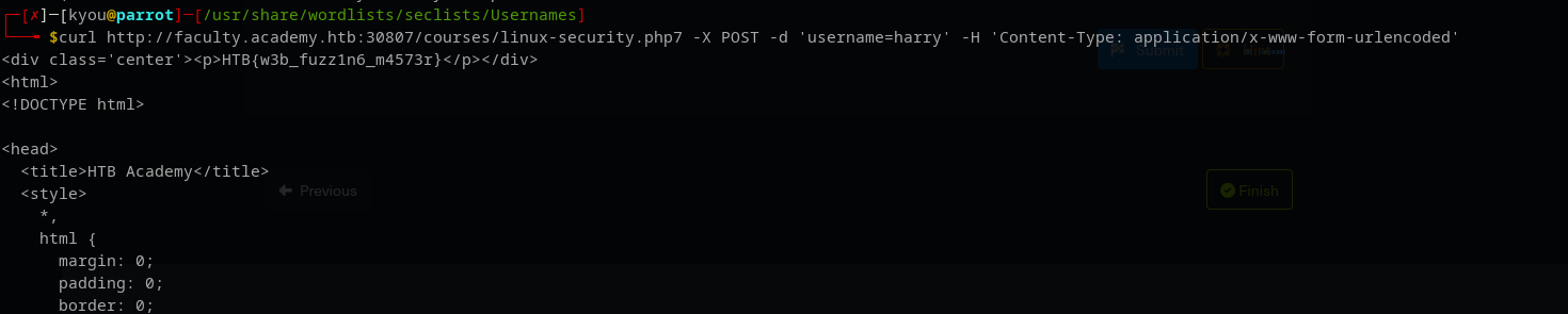 curl http://faculty.academy.htb:30807/courses/linux-security.php7 -X POST -d 'username=harry' -H 'Content-Type: application/x-www-form-urlencoded'