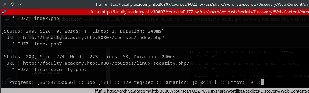 ffuf -u http://faculty.academy.htb:30807/courses/FUZZ -w /usr/share/wordlists/seclists/Discovery/Web-Content/directory-list-2.3-small.txt -e .php,.phps,.php7 -fs 287 -recursion -recursion-depth 1 -v