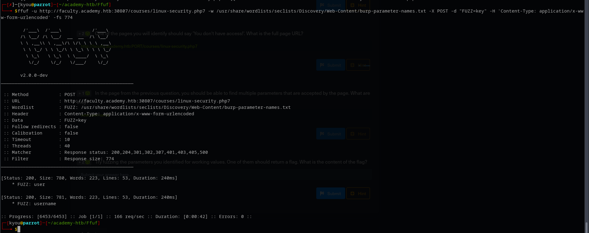 ffuf -u http://faculty.academy.htb:30807/courses/linux-security.php7 -w /usr/share/wordlists/seclists/Discovery/Web-Content/burp-parameter-names.txt -X POST -d "FUZZ=key" -H 'Content-Type: application/x-www-form-urlencoded' -fs 774