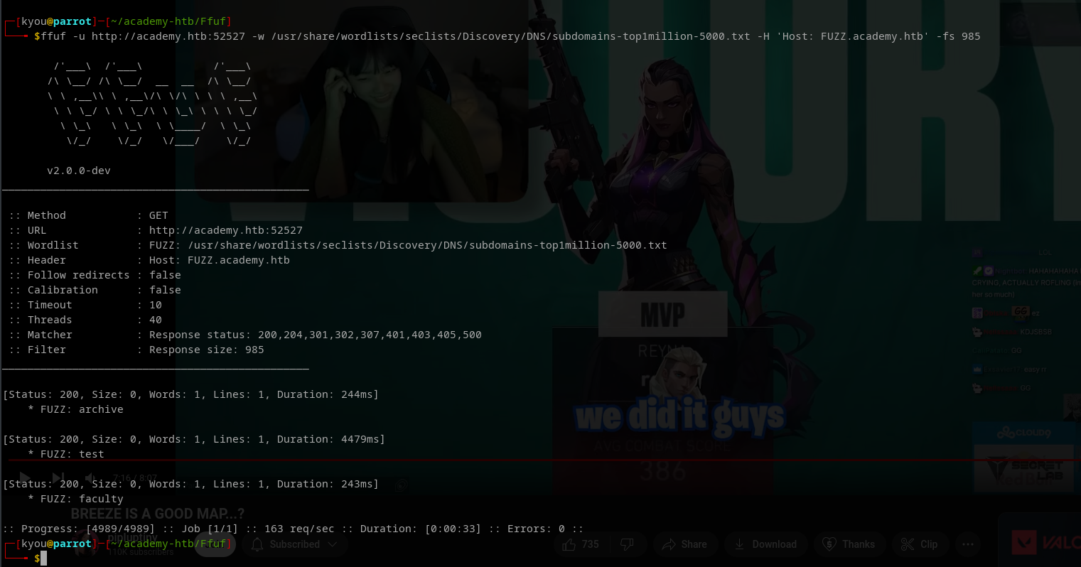ffuf -u http://academy.htb:52527 -w /usr/share/wordlists/seclists/Discovery/DNS/subdomains-top1million-5000.txt -H 'Host: FUZZ.academy.htb' -fs 985