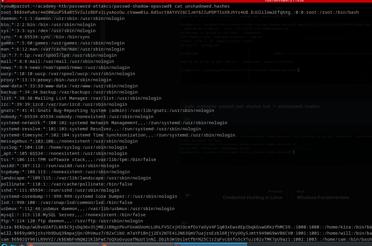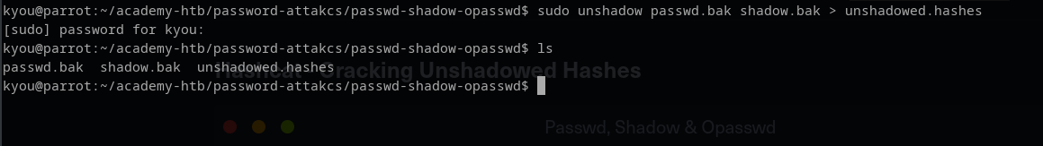 sudo unshadow passwd.bak shadow.bak > unshadowed.hashes